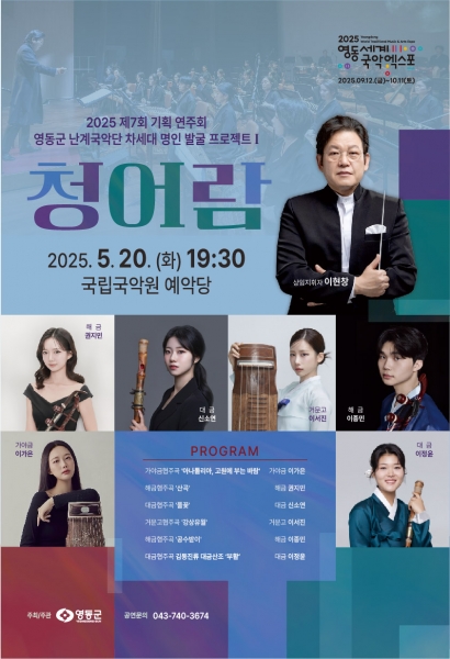 [충청뉴스큐] 충북 영동군은 오는 20일 오후 7시 30분 국립국악원 예악당에서 ‘제7회 영동군 난계국악단 차세대 명인 발굴 프로젝트 청어람’ 1차 공연을 개최한다고 밝혔다.