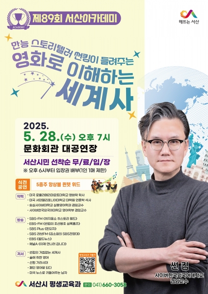 제89회 서산아카데미는 썬킴 교수가 강연을 맡아 ‘만능 스토리텔러 썬킴이 들려주는 영화로 이해하는 세계사’를 주제로 영화를 통해 세계사를 재밌게 이해하는 시간을 갖는다.