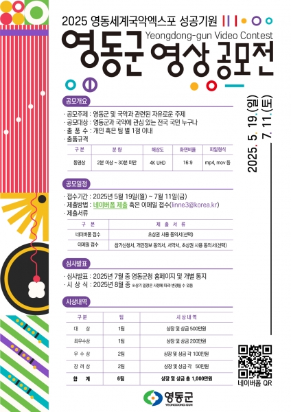 [충청뉴스큐] 충북 영동군이 국악과 지역의 매력을 전국에 알리기 위한 ‘2025 영동군 영상 공모전’을 개최한다.