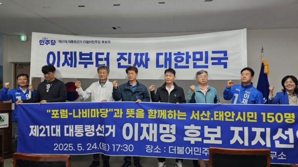 [충청뉴스큐] 지난 2025년 5월 24일 충남 서산·태안 지역의 시민 150인이 이재명 제21대 대통령 후보 지지 선언을 발표했다.
