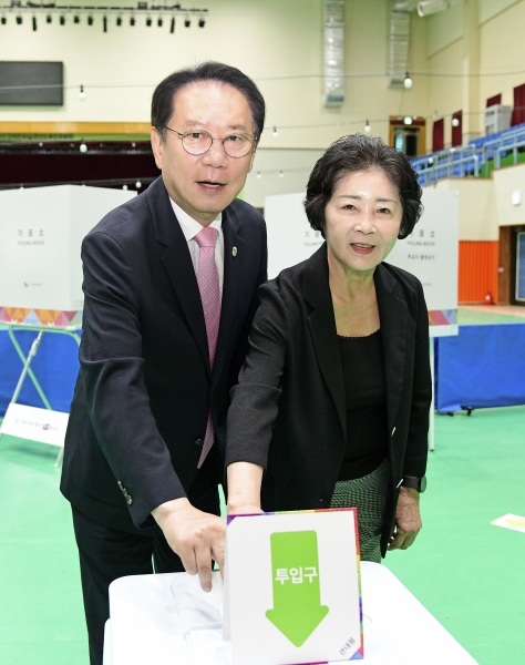 [충청뉴스큐] 송인헌 충북 괴산군수와 배우자 김영인씨가 21대 대선 사전투표일 첫날인 29일 오전 9시 괴산문화체육센터에 설치된 괴산읍사전투표소를 방문, 선거업무 종사자들을 격려한 후 투표하고 있다.