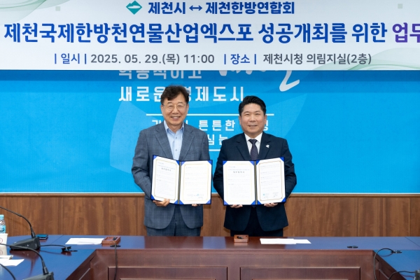 [충청뉴스큐] 제천시는 5월 29일 시청 의림지실에서 제천한방연합회와 2025 제천국제한방천연물산업엑스포의 성공적인 개최를 위한 업무협약을 체결했다.