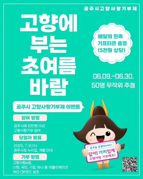 [충청뉴스큐] 공주시는 고향사랑기부제 모금 활성화를 위해 ‘고향에 부는 초여름 바람’을 주제로 6월 한 달간 특별 이벤트를 진행한다고 밝혔다.