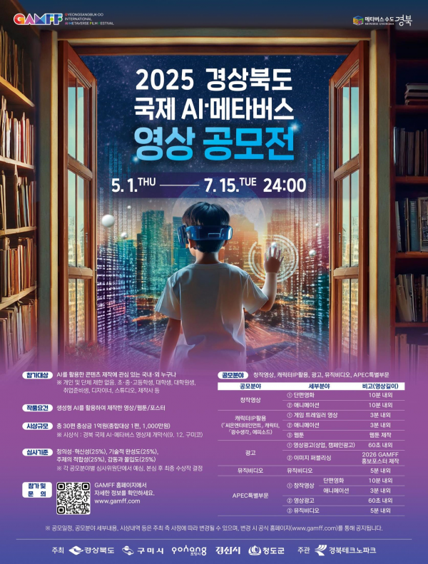최종 수상작은 9월 12일 구미코에서 열리는 ‘2025 경북 국제 AI·메타버스 영상제’ 개막식 시상식을 통해 발표되며 9월 12일부터 14일까지 구미, 포항, 경산, 청도 일대에서 개최되는 영상제 기간 동안 상영 및 전시될 예정이다.