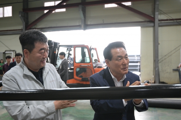 이날 첫 번째로 방문한 ㈜씨피에스는 고밀도 폴리우레탄을 사용하는 하수관 전문 제조 기업으로 다수의 특허와 첨단 기술을 기반으로 성장하고 있는 지역 내 강소기업이다.