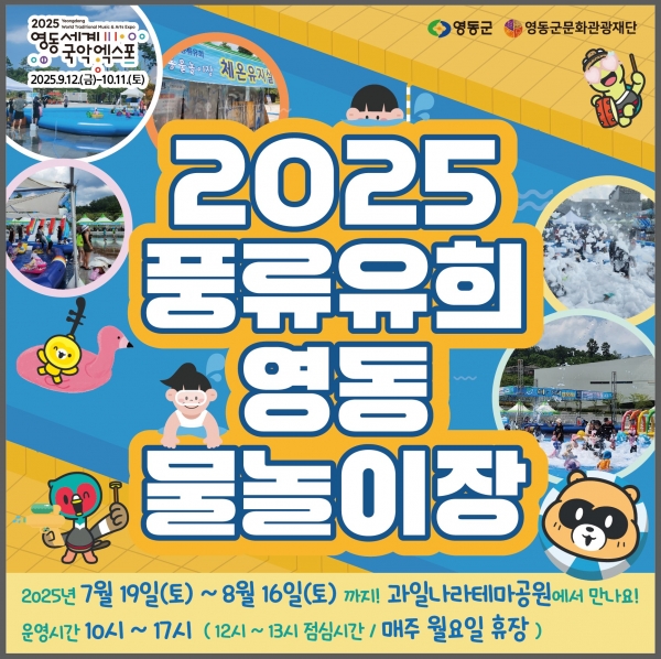 [충청뉴스큐] 충북 영동군문화관광재단은 오는 19일부터 영동 과일나라테마공원에서 ‘영동 물놀이장’과 ‘영동풍류 피크닉’ 행사를 무료로 운영한다고 밝혔다.