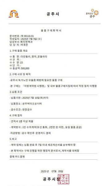 이들은 공문과 물품 구매 확약서까지 위조해 전달하고 있으며 심지어 공주시장의 직인까지 도용하는 것으로 나타났다.
