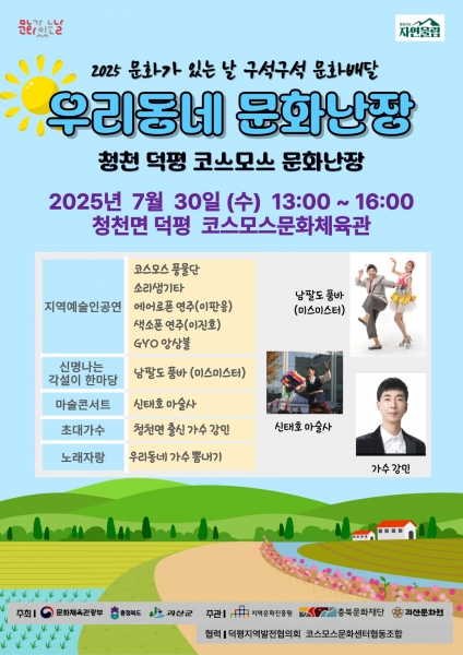 오는 7월 30일 오후 1시부터 열리는 이번 행사는 “청천 덕평 코스모스 문화난장”이라는 주제로 진행되며 지난 5월 덕평리에 개관한 코스모스문화체육관에서 열려 무더위를 식히는 실내 문화행사로 꾸며질 예정이다.