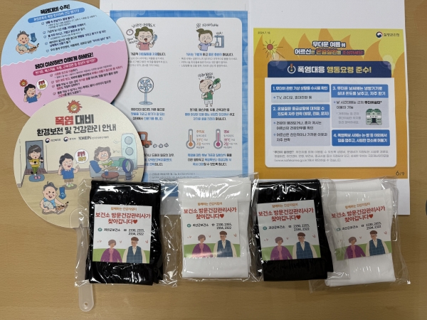 이번에 배부된 물품은 부채, 쿨토시, 건강수칙 안내문, 온열질환 예방 포스터 등으로 구성됐다.