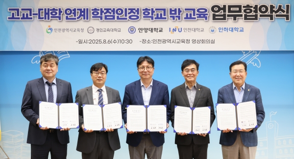 [충청뉴스큐] 인천광역시교육청은 6일 경인교육대학교, 안양대학교, 인천대학교, 인하대학교 등 인천 지역 4개 대학과 ‘고교–대학 연계 학점인정 학교 밖 교육 협력’ 업무협약을 체결했다.