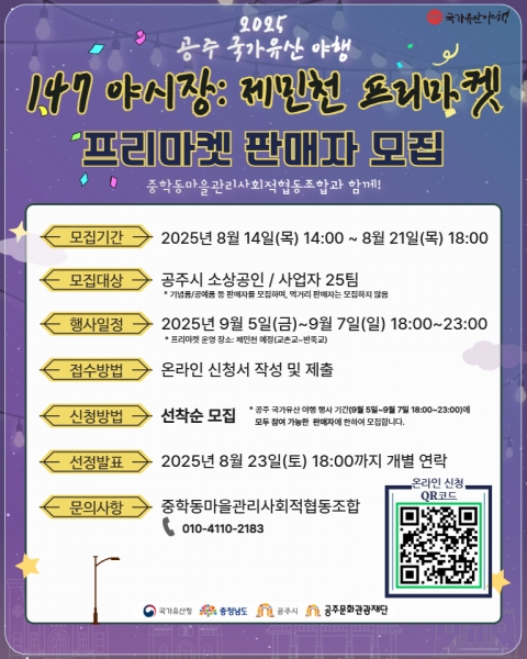 [충청뉴스큐] 공주문화관광재단은 9월 5일부터 9월 7일까지 개최하는 ‘2025 공주 국가유산 야행’ 147 야시장: 제민천 프리마켓 판매자를 모집한다.