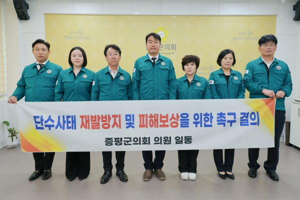 증평군의회 의원들은 결의문을 통해“지난 5일 송수관로 파손으로 인해 일어난 대규모 단수 사태로 1만 8,000여 가구가 무더위 속에서 일상생활에 큰 불편을 겪었고 특히 자영업자 등 소상공인들은 물부족으로 영업을 중단하며 심각한 영업손실을 보았다”며 “한국수자원공사는 임시관로와 송수관을 연결하는 복구공사를 완료해 수돗물 공급을 정상화했지만, 이는 임시방편 조치에 불과하고 단일 송수관에 의해 물을 공급받고 있는 구조적 한계로 단수사태는 언제든 다시 터질 수 있는 시한폭탄과 같다”고 말했다.