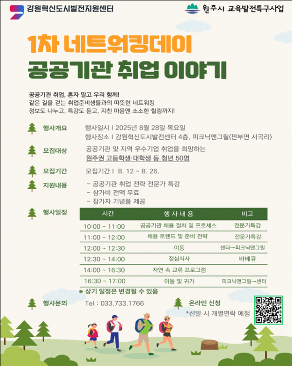 이번 프로그램은 공공기관 및 지역 우수기업 취업을 희망하는 원주권 고등학생·대학생 등 청년들을 대상으로 강원혁신도시발전지원센터와 자연체험공간 ‘피크닉앤그릴’에서 오전 10시부터 오후 5시까지 진행되며 청년들의 공공기관 취업 역량 강화와 심리적 재충전을 목표로 마련됐다.