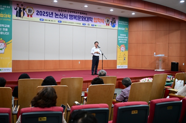 [충청뉴스큐] 논산시는 20일 건양대학교 명곡정보관 무궁화장홀에서 시민 평생학습 프로그램 ‘2025년 행복문화대학’ 입학식을 개최했다.
