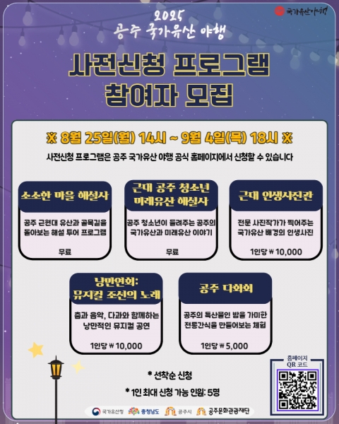 [충청뉴스큐] 공주문화관광재단은 9월 5일부터 7일까지 개최되는 ‘2025 공주 국가유산 야행’의 사전신청 프로그램 참여자를 모집한다고 밝혔다.
