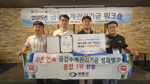 [충청뉴스큐] 충북 영동군은 28일 금강유역환경청에서 주관하는 2025년 금강수계관리기금 워크숍에서 2024년도 금강수계관리기금사업 성과평가 종합 1위에 선정되며 3년 연속 종합 1위의 영광을 안았다고 밝혔다.