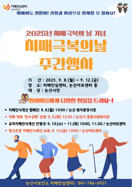 [충청뉴스큐] 논산시는 ‘치매여도 괜찮아 관심과 사랑으로 함께 할 수 있어요’라는 주제로 오는 9월 8일부터 12일까지 ‘2025년 치매 극복의 날’ 주간행사를 운영한다.