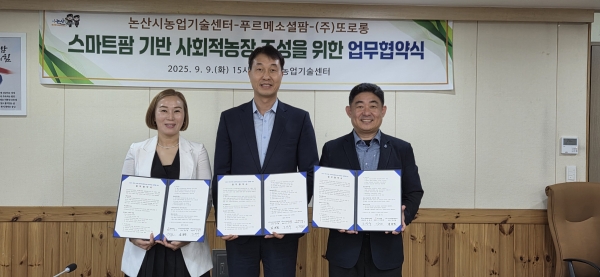 [충청뉴스큐] 논산시농업기술센터는 9일 푸르메소셜팜, ㈜또로롱과 함께 발달장애인의 안정적 고용과 자립 지원, 농업 일자리 확대를 위한 3자 업무협약을 체결했다.