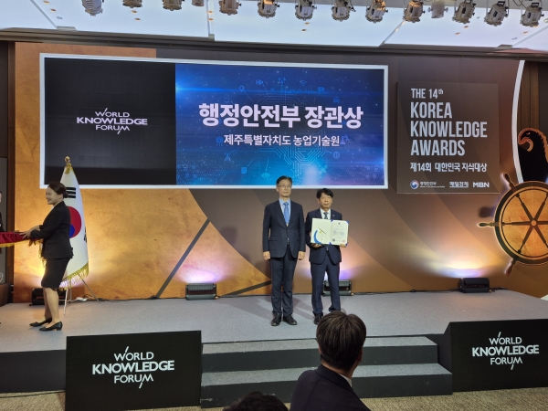 제주도는 ‘현장 데이터 기반 문제 해결형 농업 디지털 대전환 플랫폼 제주DA 구축’ 사업의 혁신성을 인정받아 행안부 주최 ‘제14회 대한민국 지식대상’에서 우수상을 받았다.
