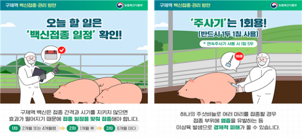 기존에는 매년 4월과 10월에 접종을 시행했으나, 지난 3월 전남 지역에서 구제역이 발생함에 따라 올해부터는 접종 시기를 1개월 앞당겨 3월과 9월에 실시한다.