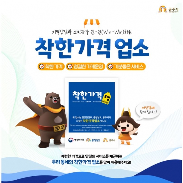 [충청뉴스큐] 공주시는 저렴한 가격으로 지역 물가 안정에 기여하고 있는 ‘착한가격업소’를 오는 24일까지 공개 모집한다고 밝혔다.