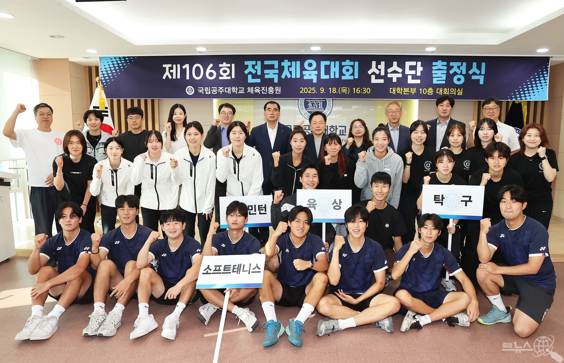 국립공주대학교(총장 임경호)는 18일 대학본부 대회의실에서 임경호 총장을 비롯한 체육진흥원장, 충남체육회 및 공주시체육회 관계자, 감독, 코치, 참가선수 등이 참석한 가운데 제106회 전국체육대회 선수단 출정식 행사를 가졌다.