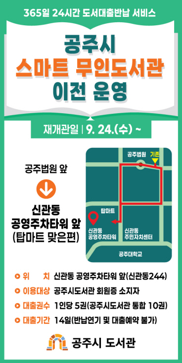 새로운 위치인 신관동 공영주차타워 앞은 대중교통 이용이 편리하고 국립공주대학교와 신관동 주민자치센터 등 교육기관과 생활 편의시설이 인접해 있어 다양한 계층의 시민들이 보다 쉽게 무인도서관 서비스를 이용할 수 있을 것으로 기대된다.