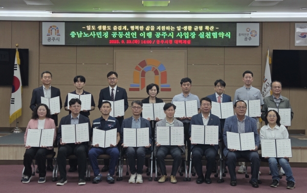 [충청뉴스큐] 공주시는 지난 23일 시청 대백제실에서 충남 노사민정 공동선언의 구체적 이행을 위한 실천 협약을 체결하고 일·생활 균형 확산에 힘을 모으기로 했다고 밝혔다.