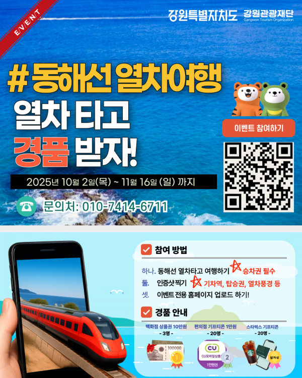 [충청뉴스큐] 강원특별자치도와 강원관광재단은 오는 10월 2일부터 11월 16일까지 ‘KTX 동해선 철도여행 인증 이벤트’를 운영한다고 밝혔다.