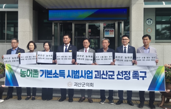 아울러 의원들은 “농어촌 기본소득 시범 사업은 단순한 소득 지원이 아니라, 주민들의 안정된 삶을 바탕으로 지역경제를 살리고 나아가 지방 소멸이라는 중대한 과제를 해결할 수 있는 실질적인 대안”이라고 역설하며.‘농어촌 기본소득 시범 사업 괴산군 선정 촉구’ 현수막을 들고 정부의 조속한 결단을 요구했다.