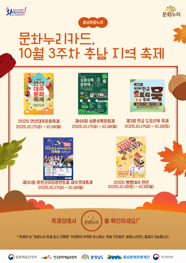[충청뉴스큐] 충남문화관광재단은 10월 셋째 주를 맞아 문화누리카드 사용이 가능한 도내 지역 축제 정보를 소개하며 문화누리카드 이용자들이 가을 정취 속에서 충남의 다양한 매력을 만끽하길 바란다고 밝혔다” 문화누리카드는 문화체육관광부, 한국문화예술위원회, 충청남도, 충남문화관광재단이 함께 운영하는 공익사업으로 기획재정부 복권위원회의 복권기금을 통해 지원된다.