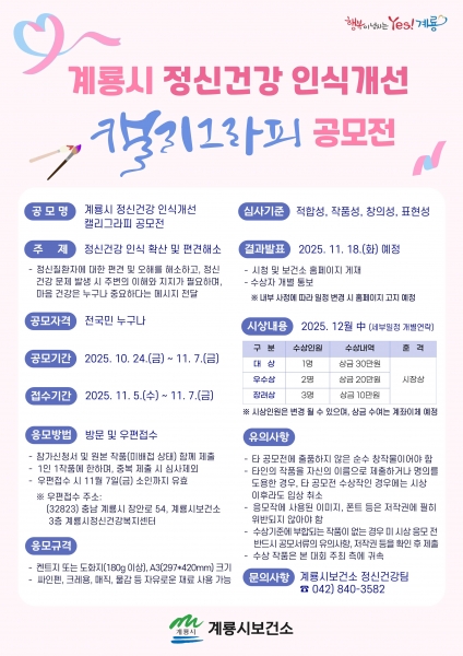 [충청뉴스큐] 계룡시는 정신건강 홍보주간을 맞아 시민이 직접 참여하는 ‘계룡시 정신건강 인식개선 캘리그라피 공모전’을 개최한다.