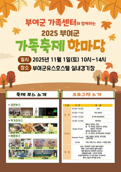 [충청뉴스큐] 부여군 가족센터는 오는 11월 1일 오전 10시부터 오후 2시까지 부여군유스호스텔 실내경기장에서 ‘2025년 부여군 가족축제 한마당’을 개최한다고 밝혔다.