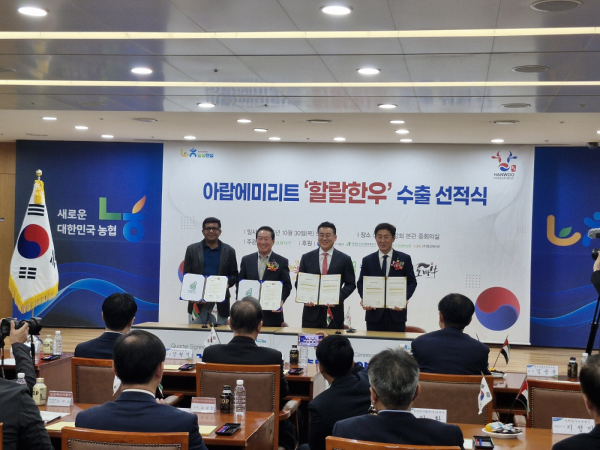 [충청뉴스큐] 대한민국 축산물 브랜드경진대회에서 2019년, 2021년, 2023년 대통령상을 수상한 강원특별자치도 통합브랜드 ‘강원한우’ 가 10월 30일 서울 농협중앙회 본관에서 ‘강원한우 아랍에미리트 수출 선적식’을 개최했다.
