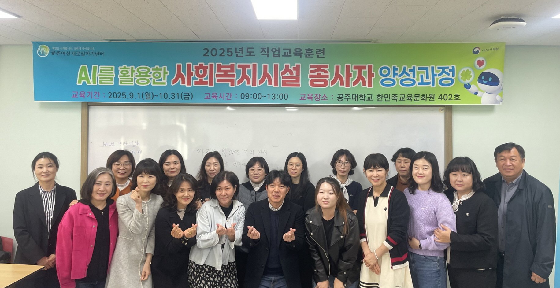 [충청뉴스큐] 공주여성새로일하기센터는 지난 31일 국립공주대학교 옥룡캠퍼스 평생교육원에서 국비지원 직업교육훈련 ‘인공지능(AI)을 활용한 사회복지시설 종사자 양성과정’을 성공적으로 마무리했다고 밝혔다.