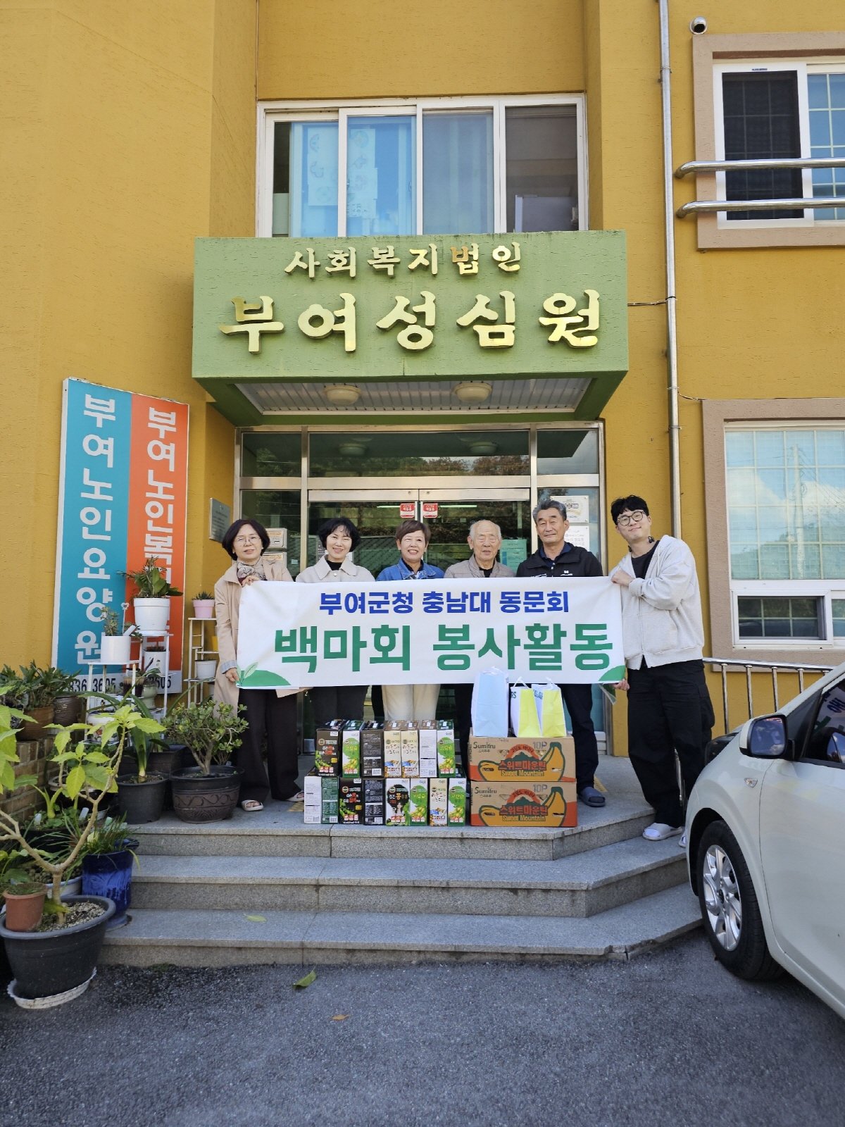 [충청뉴스큐] 부여군청 충남대학교 졸업생 모임인 부여군백마회는 부여읍에 소재한 부여성심원을 방문해 따뜻한 봉사활동을 펼쳤다고 5일 밝혔다.
