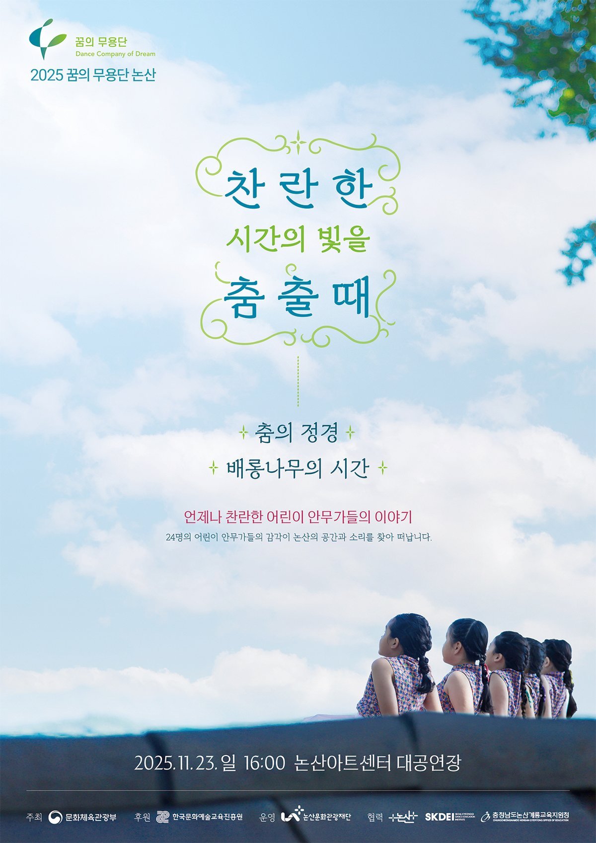 [충청뉴스큐] 논산문화관광재단이 오는 11월 23일 오후 4시 논산아트센터 대공연장에서 2025 꿈의 무용단 논산 정기공연 ‘찬란한 시간의 빛을 춤출때’를 개최한다고 밝혔다.
