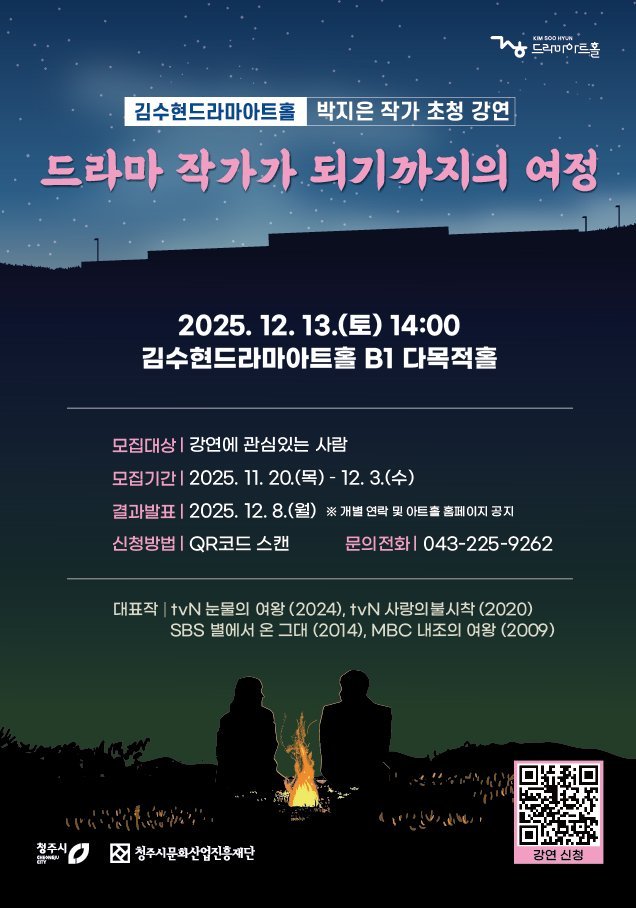 청주시문화산업진흥재단이 운영하는 국내 유일 드라마문학관 김수현드라마아트홀은 다음달 3일 오후 4시까지 ‘박지은 작가 초청 강연’참여자를 모집한다.