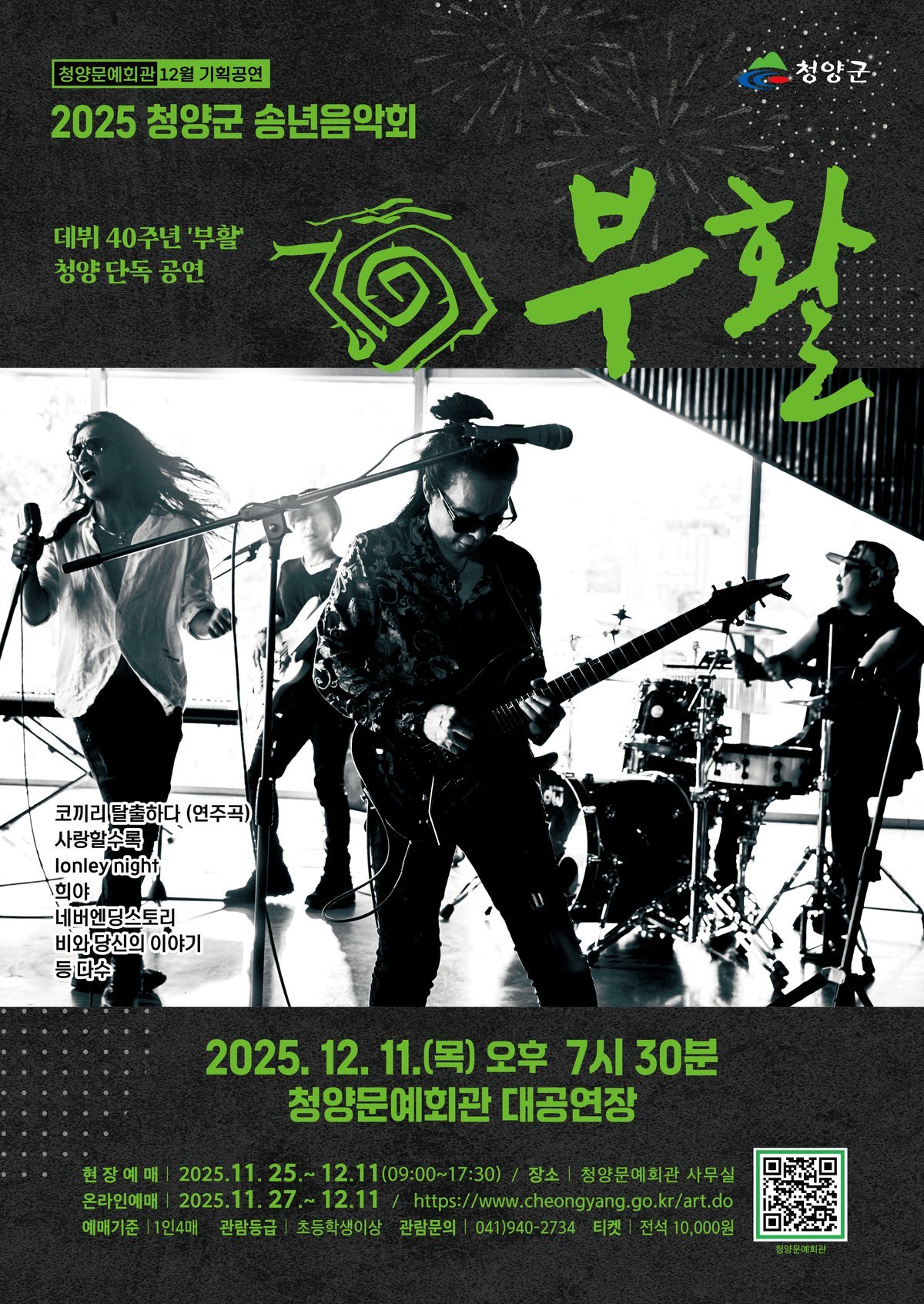 [충청뉴스큐] 청양군은 오는 12월 11일 저녁 7시 30분, 청양문예회관 대공연장에서 대한민국을 대표하는 록 그룹 ‘부활’의 공연을 개최한다고 밝혔다.