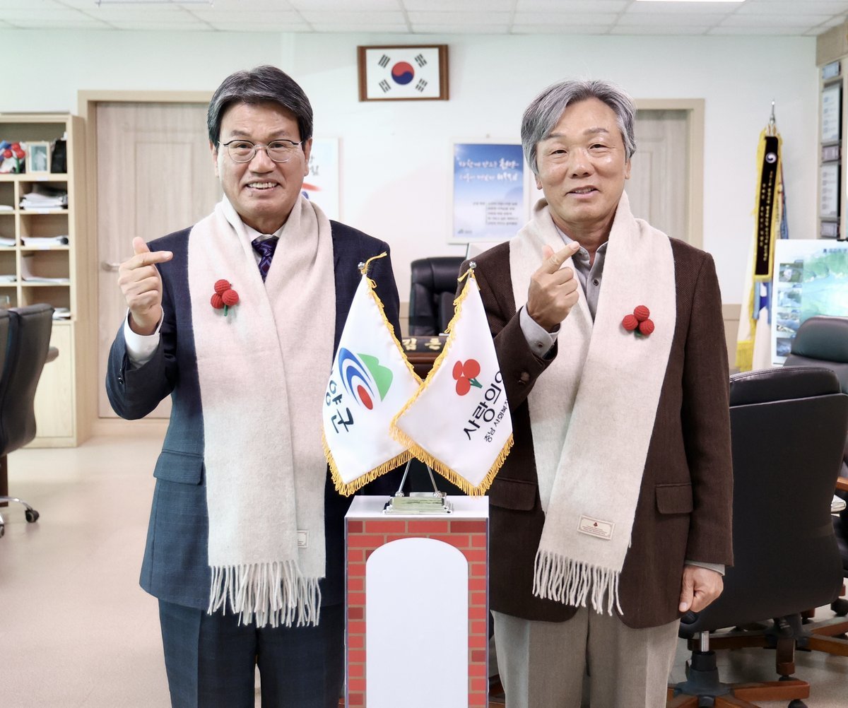 *사진설명: 김돈곤 군수와 충남사회복지공동모금회 성우종 회장이 함께 포즈를 취하고 있다.