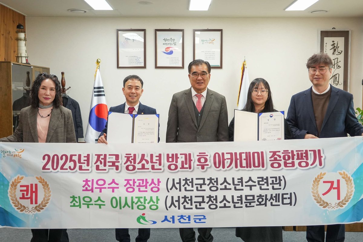 [충청뉴스큐] 서천군이 운영하는 서천군청소년수련관과 서천군청소년문화센터가 지난달 28일 성평등가족부와 한국청소년진흥원이 실시한 2025년 전국 청소년 방과후 아카데미 종합평가에서 나란히 최우수상을 수상했다.