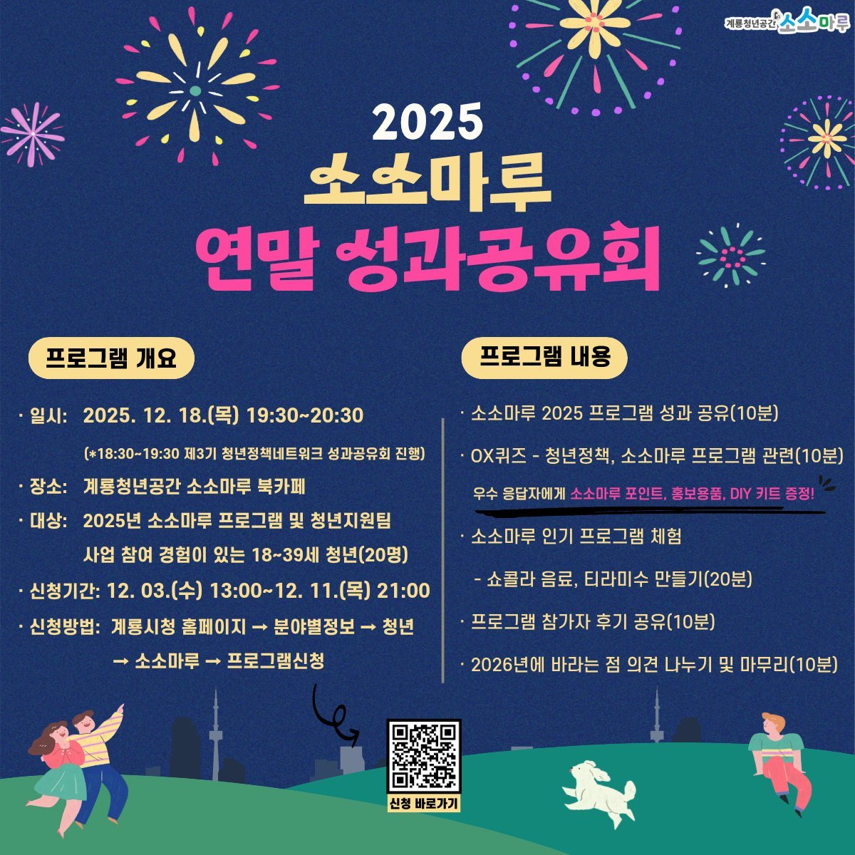 계룡시 관계자는 “청년들이 올 한 해 활동을 돌아보고 서로를 격려하는 뜻깊은 자리가 될 것”이라며 “앞으로도 청년들의 의견을 반영한 소통 중심 공간으로 소소마루를 운영해 나가겠다”고 말했다.