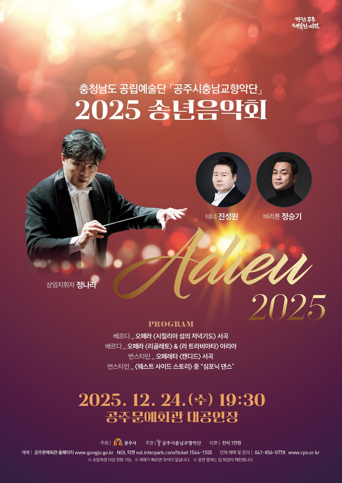[충청뉴스큐] 충청남도 공립예술단인 공주시충남교향악단은 다사다난했던 2025년을 마무리하며 성탄의 기쁨과 송구영신의 마음을 담은 송년음악회 ‘Adieu 2025’를 오는 12월 24일 오후 7시 30분 공주문예회관 대공연장에서 개최한다고 밝혔다.