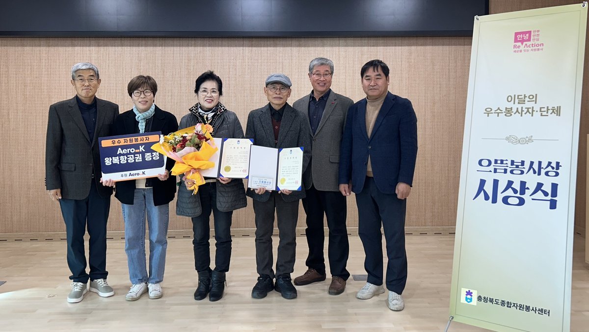 [충청뉴스큐] 청주시자원봉사센터는 12일 센터에서 충청북도종합자원봉사센터 주관으로 ‘으뜸 봉사상’시상식과 에어로케이 후원 항공권 증정식을 개최했다.