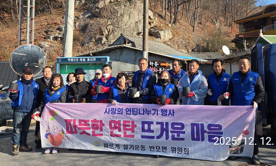 반포면 바르게살기위원회는 해마다 어려운 이웃을 위해 연탄 나눔 봉사활동을 이어오고 있으며, 다양한 봉사활동을 통해 꾸준히 이웃 사랑을 실천하고 있다.