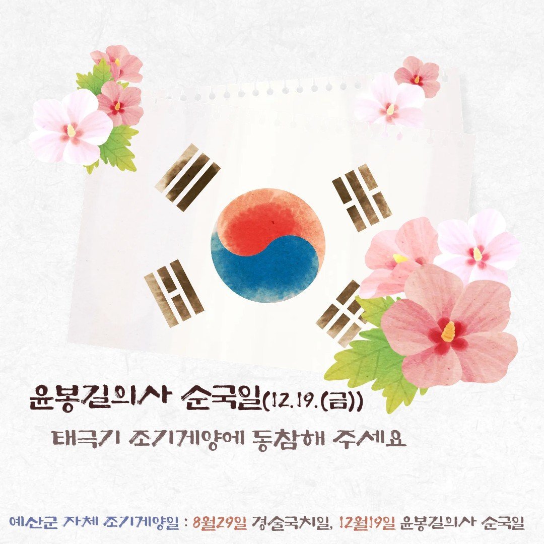 한편 군은 올해 조례 개정을 통해 대한민국국기법에 따른 국기 게양일인 3·1절, 제헌절, 광복절, 개천절, 한글날, 현충일, 국군의 날 외에도 △4월 29일 윤봉길 의사 의거일 △8월 29일 경술국치일 △12월 19일 윤봉길 의사 순국일을 조기 게양일로 지정했다.