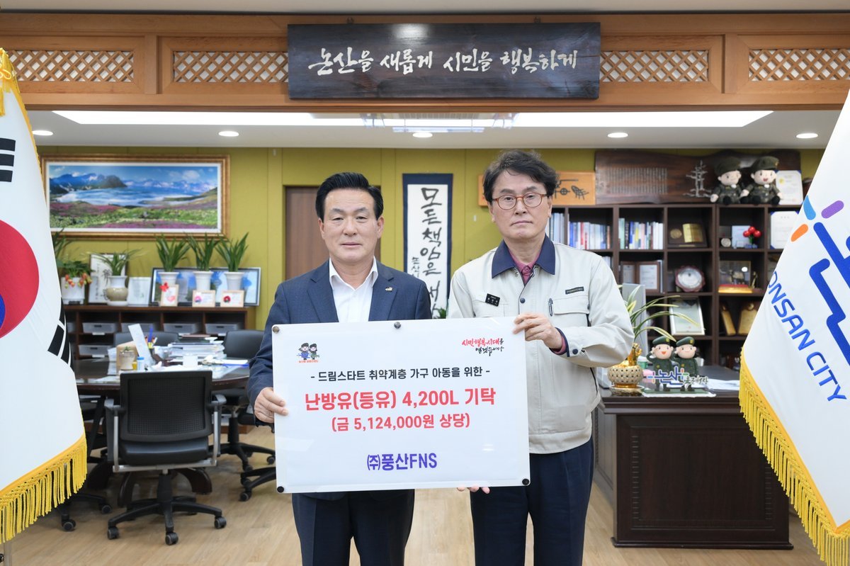 [충청뉴스큐] 논산시는 15일 국방산업 전문기업 ㈜풍산FNS가 저소득 아동들을 위해 약 500만 원 상당의 등유 4200리터를 기탁했다고 밝혔다.