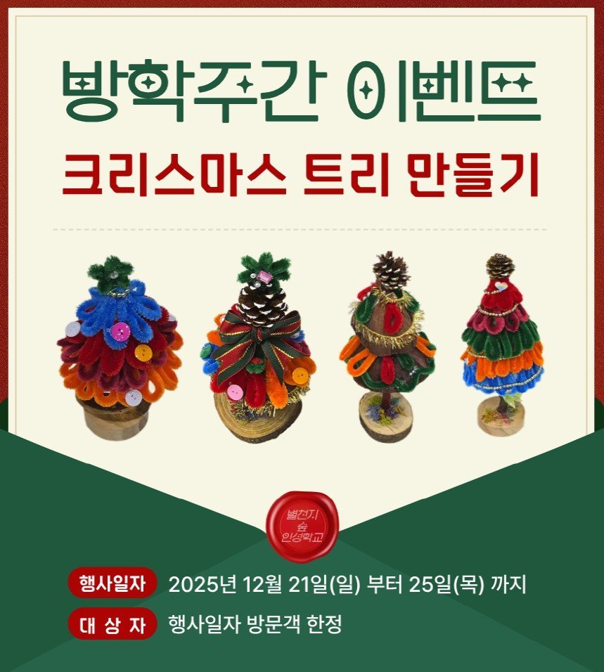 완성된 크리스마스트리와 자연물 액자는 별천지숲인성학교 실내 곳곳에 전시돼 겨울방학 동안 아이들과 학부모가 함께 감상할 수 있도록 할 예정이다.