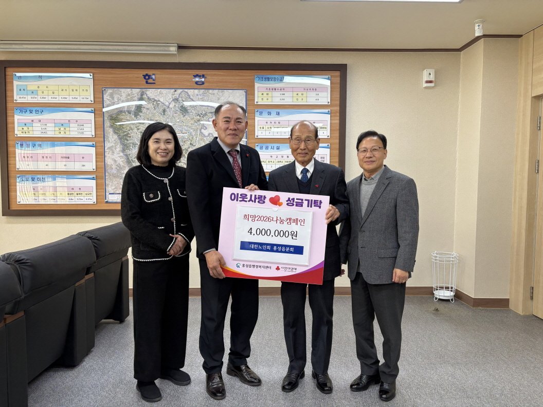 [충청뉴스큐] 대한노인회 홍성읍분회는 지난 17일 홍성읍 행정복지센터를 방문해 ‘희망2026 이웃돕기 성금’으로 400만 원을 기탁하며 지역사회에 따뜻한 나눔을 실천했다.