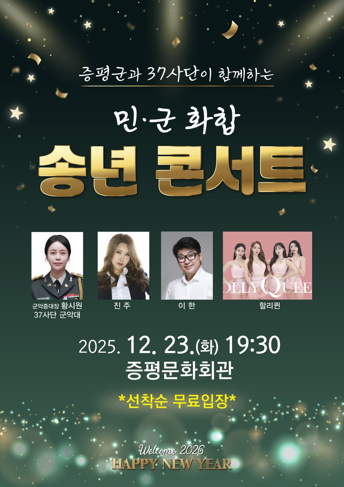 [충청뉴스큐] 충북 증평군은 오는 12월 23일 오후 7시 30분, 증평문화회관에서 민과 군 함께 어우러지는‘민·군화합 송년콘서트’를 개최한다.